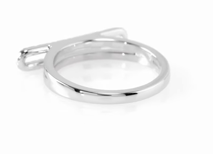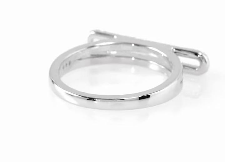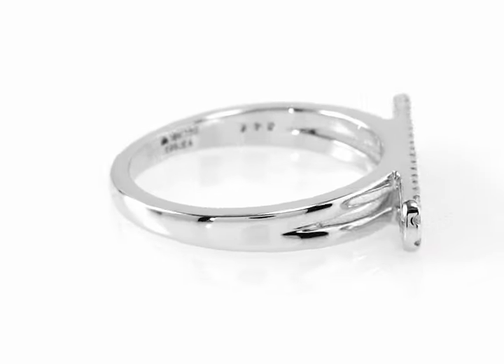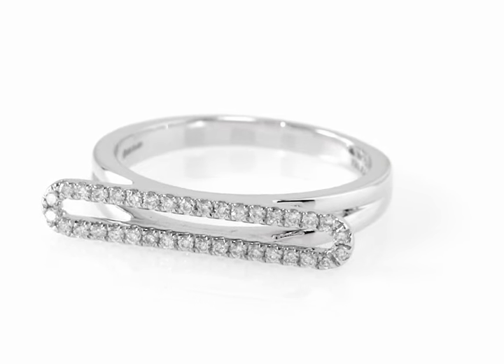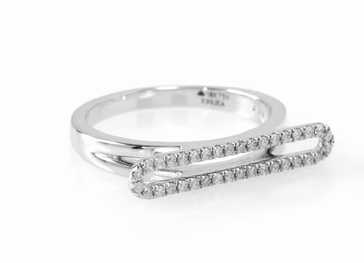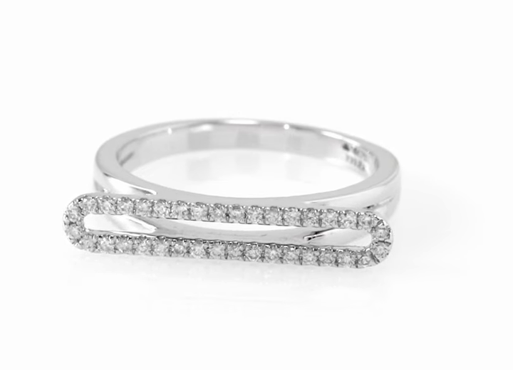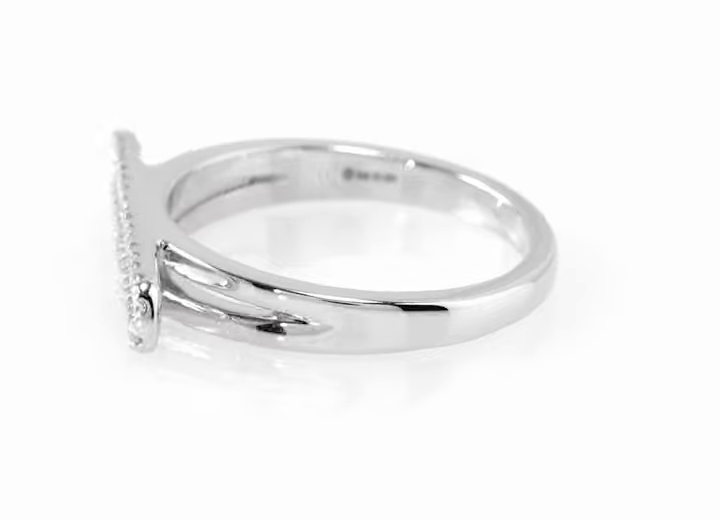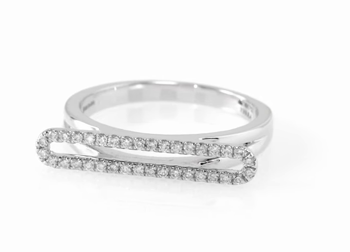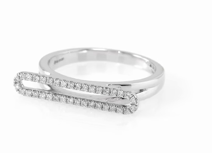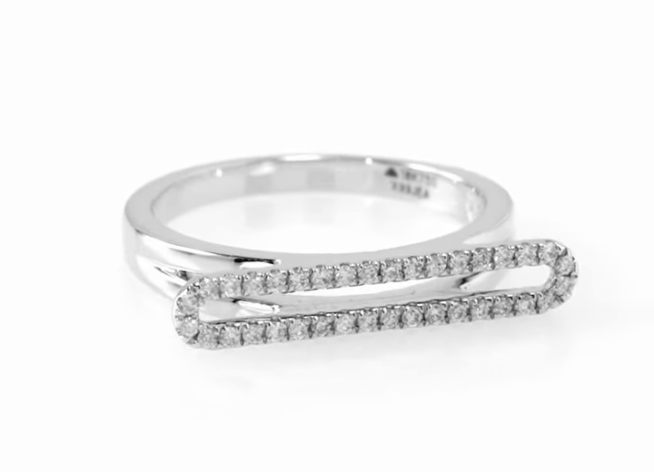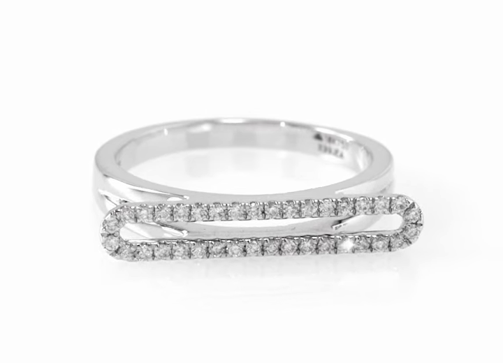 This is a sleek and contemporary diamond ring crafted in white metal, likely white gold or platinum. The design features a smooth polished band with a unique elongated oval loop at the front, where one side of the loop is delicately encrusted with small round-cut diamonds in a pavé setting, adding subtle sparkle and elegance. The contrasting plain and diamond-lined surfaces create a modern, refined look that feels both minimalistic and stylish, making it perfect for everyday wear or as a statement of understated sophistication.